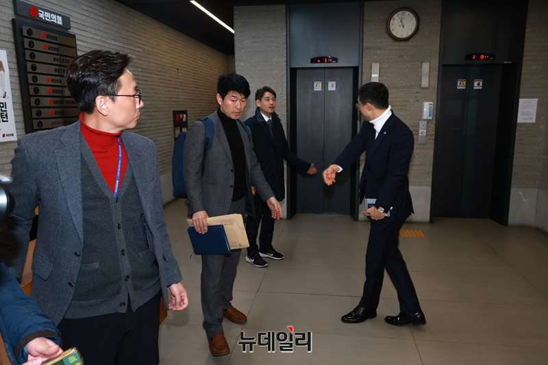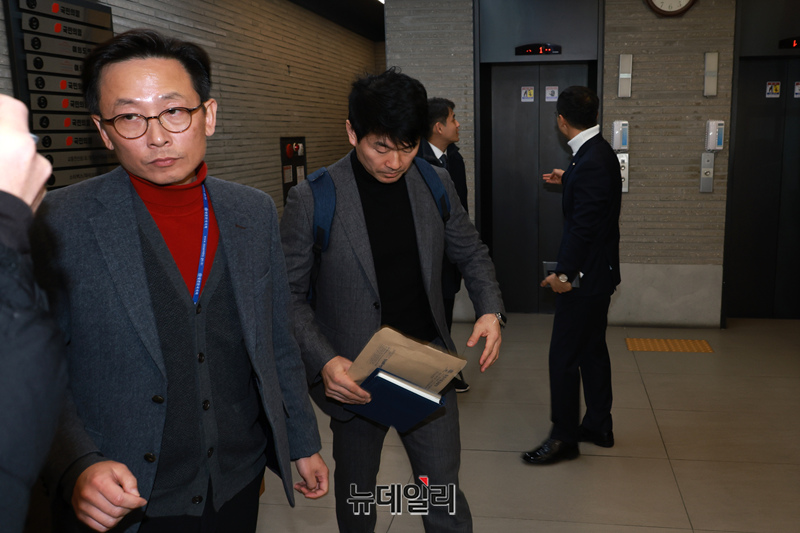 명태균씨의 공천개입 의혹과 관련해 압수수색에 나선 창원지검 관계자들이 7일 오전 서울 여의도 국민의힘 중앙당사를 나와 이동하고 있다.