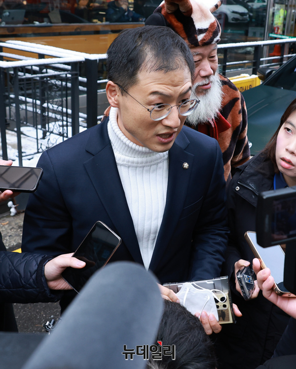 김상욱 국민의힘 의원이 7일 오전 서울 여의도 국민의힘 중앙당사에 대한 압수수색과 관련해 기자들의 질문을 받고 있다. 이번 압수수색은 명태균 씨의 공천 개입 의혹과 관련해 이뤄졌다.