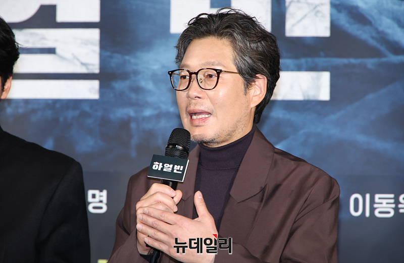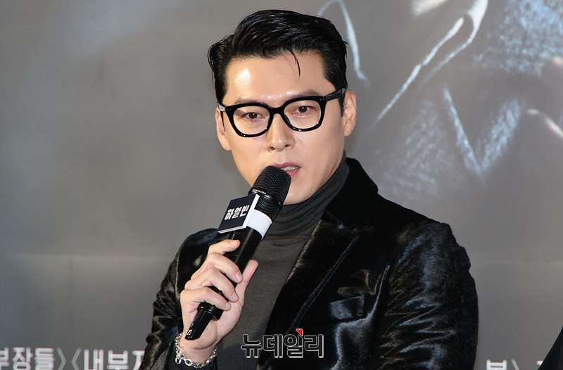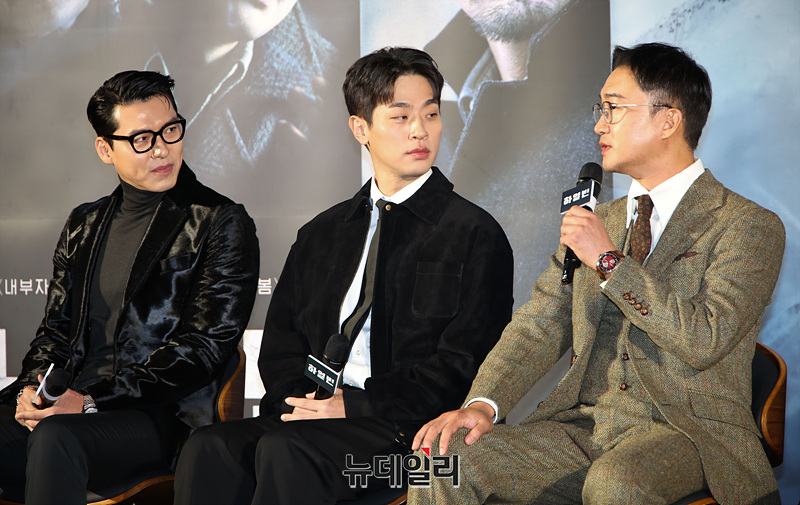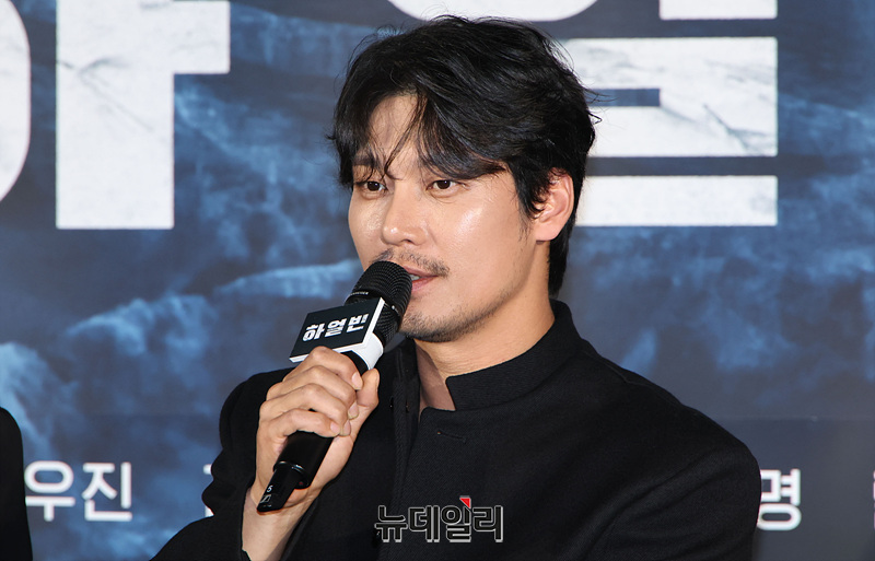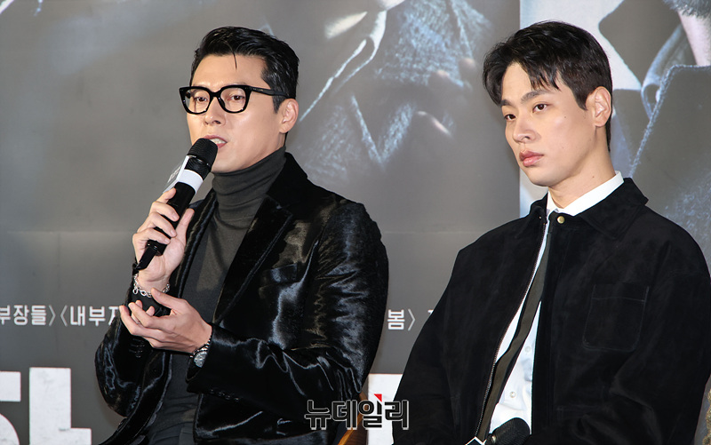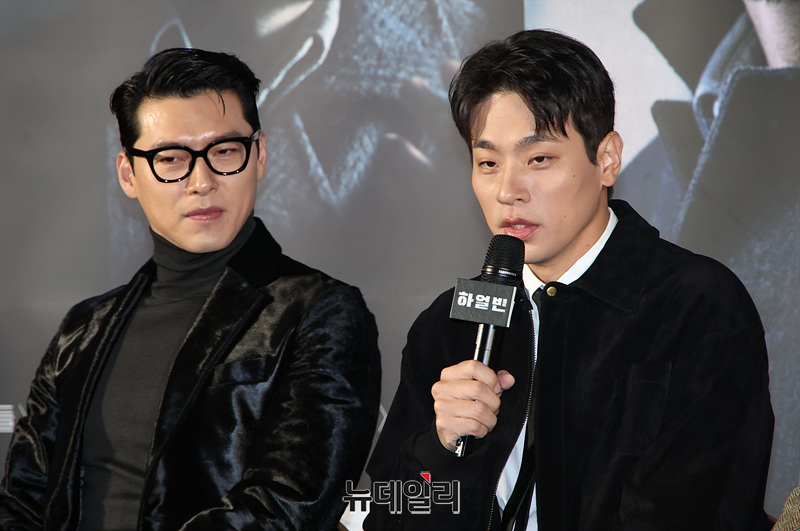 배우 현빈, 박정민, 조우진, 전여빈, 박훈, 유재명, 이동욱이 27일 오전 서울 CGV용산아이파크몰에서 열린 영화 '하얼빈(감독 우민호)' 제작보고회에서 인사말을 하고 있다.