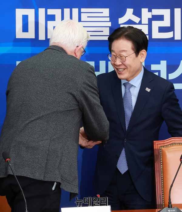 [포토] 참석자들과 인사 나누는 이재명 민주당 대표