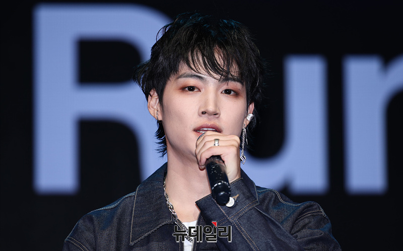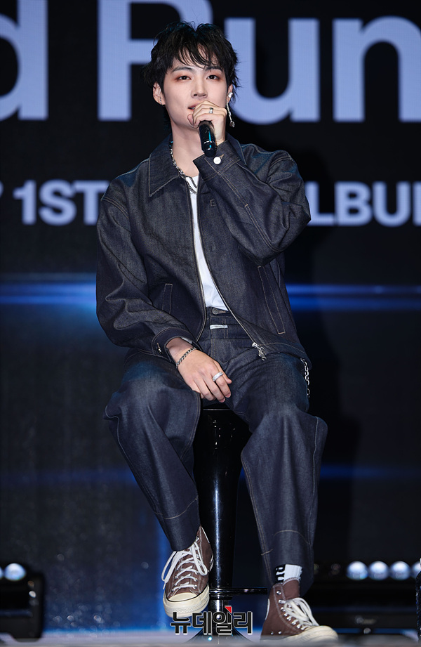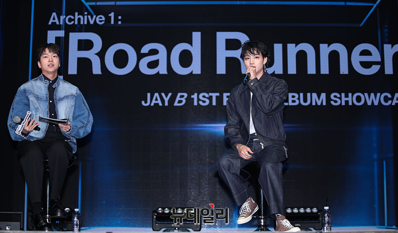 갓세븐 제이비(JAY B)가 27일 오후 서울 광진구 예스24 라이브홀에서 열린 정규1집 '아카이브 원: [로드 러너](Archive 1: [Road Runner])' 발매 기념 미디어 쇼케이스에서 앨범을 소개하고 있다.