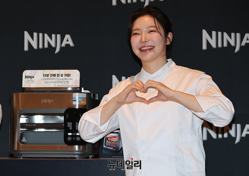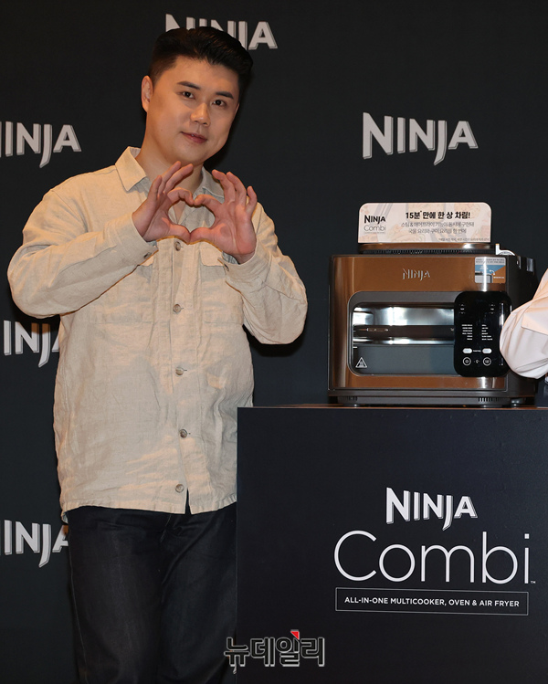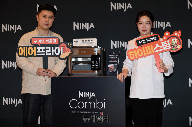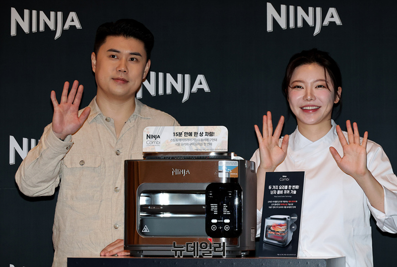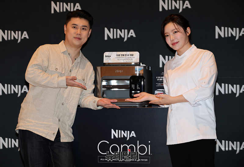 권성준, 조서형 셰프가 28일 오전 서울 용산구 그랜드하얏트에서 열린 샤크닌자 주방가전 브랜드 닌자(Ninja) '콤비 올인원 멀티 쿠커' 출시행사에서 포즈를 취하고 있다.이번 신제품은 단 한대로 스팀과 에어프라이 기능을 구현해 두 가지 요리를 동시에 완성할 수 있는 것이 특징이다.권성준, 조서형 셰프는 넷플릭스 흑백요리사에서 '나폴리 마피아' '장사천재 조사장'으로 각각 출연했다.