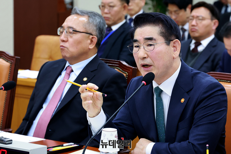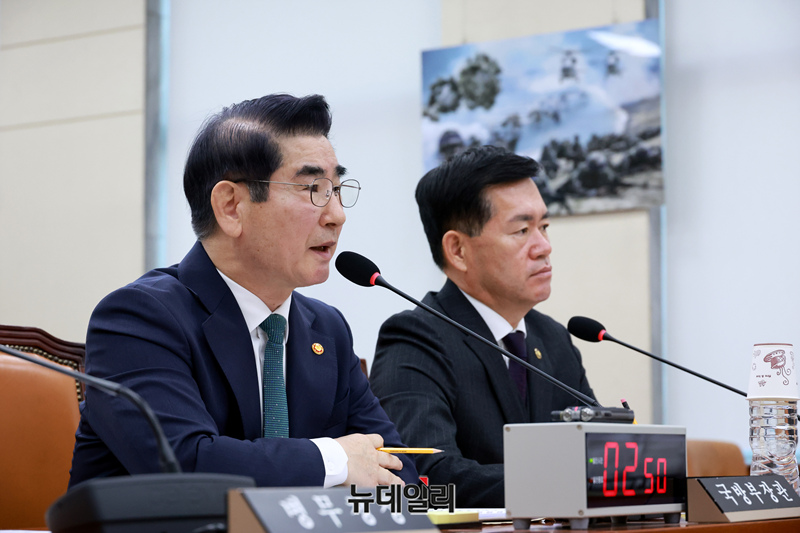 김용현 국방부 장관이 28일 오전 국회에서 열린 국방위원회 전체회의에서 의원 질의에 답변하고 있다.