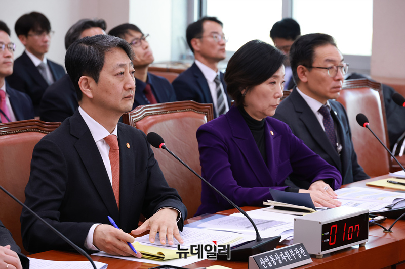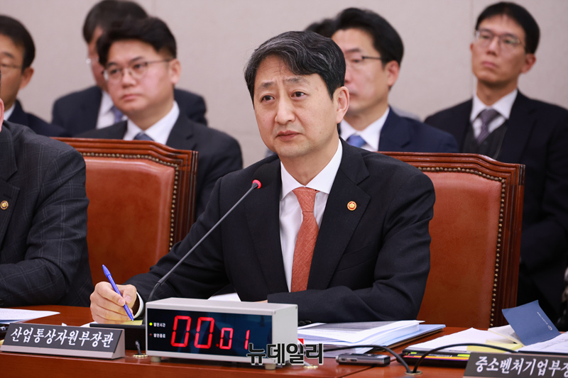 안덕근 산업통상자원부 장관이 28일 오전 국회에서 열린 산업통상자원중소벤처기업위원회 전체회의에서 의원들의 질의에 답변하고 있다