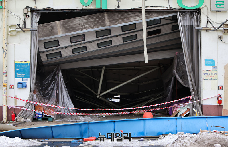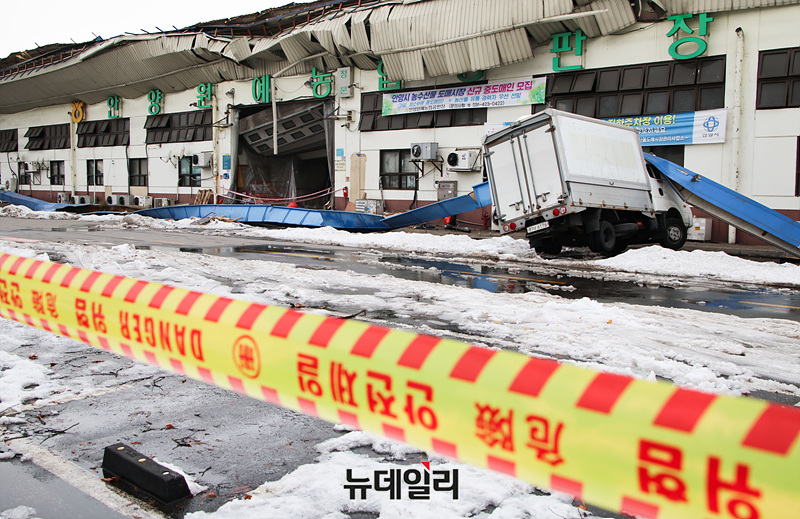 연이어 내린 폭설로 경기 안양농수산물시장 건물이 붕괴된 가운데 29일 오후 건물 출입이 통제되고 있다.