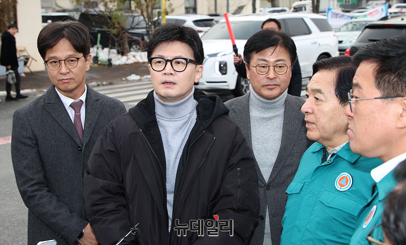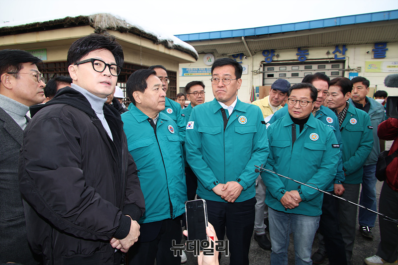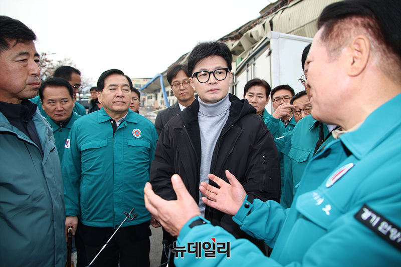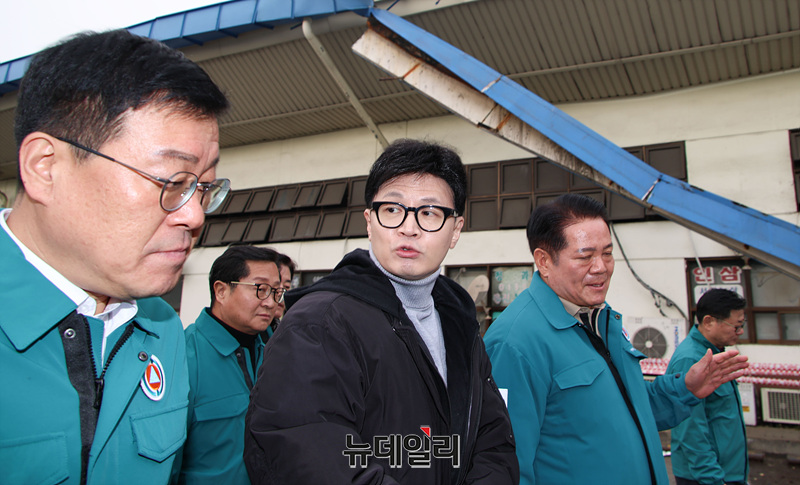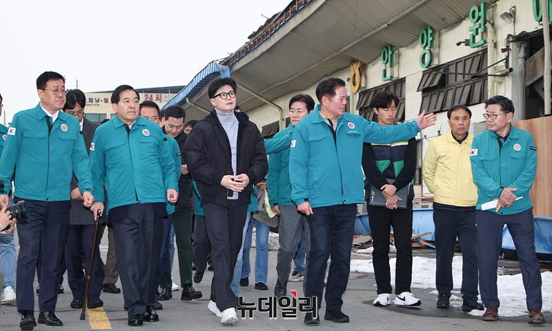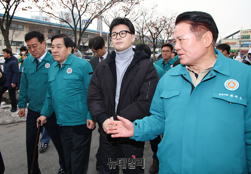한동훈 국민의힘 대표가 1일 오후 지난 폭설 때 지붕이 붕괴된 안양 농수산물도매시장을 방문해 최대호 안양시장, 심재철 국민의힘 경기도당위원장과 현장을 둘러보고 있다.