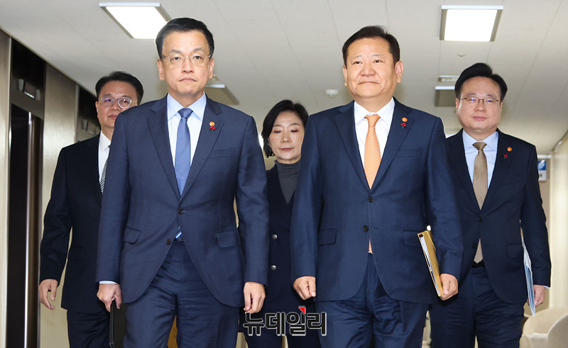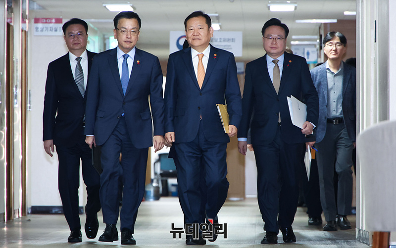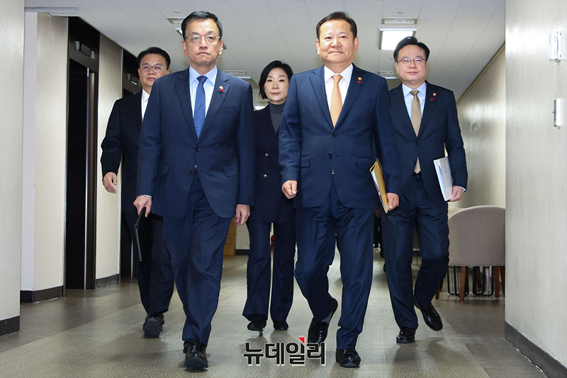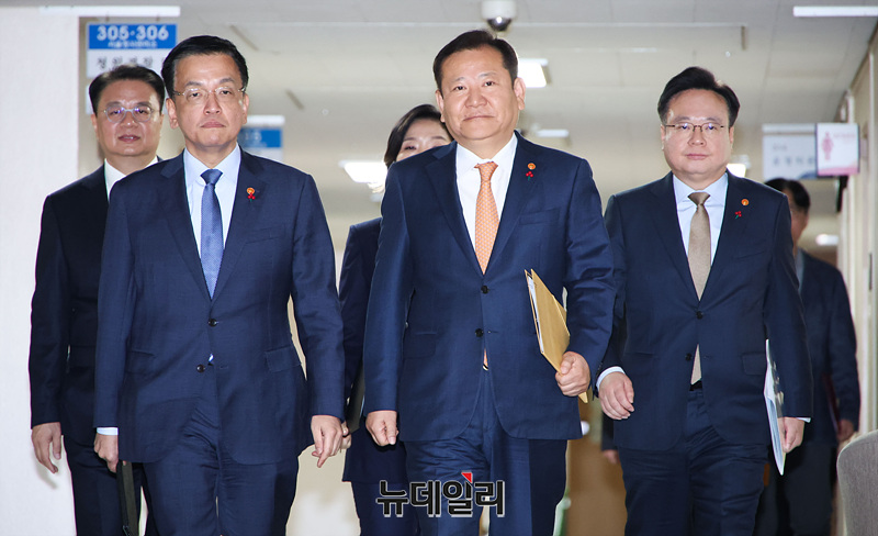 최상목 부총리 겸 기획재정부 장관, 오영주 중소벤처기업부 장관, 조규홍 보건복지부 장관, 이상민 행정안전부 장관, 방기선 국무조정실장이 2일 오전 서울 종로구 정부서울청사에서 열린 야당 단독감액안 정부입장 합동 브리핑에 참석하고 있다.