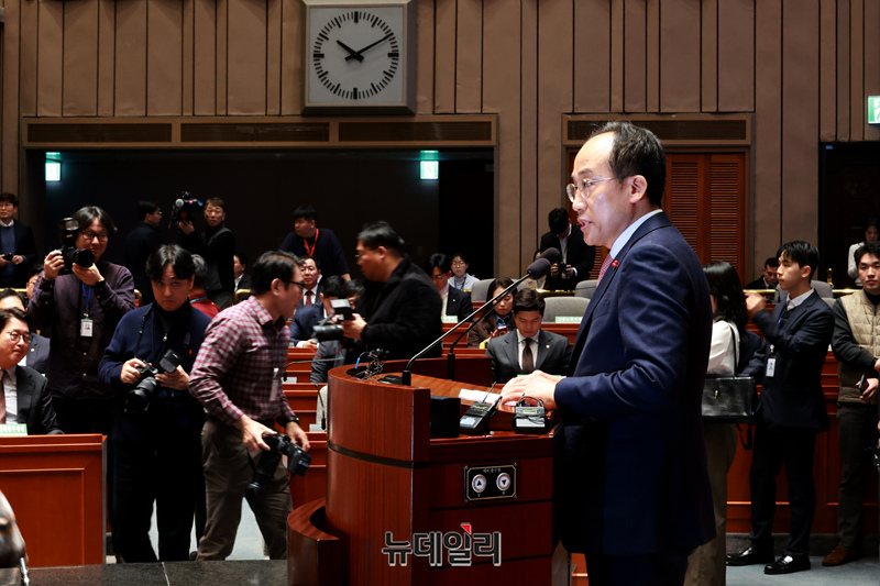 이날 추 원내대표는 "감사원장, 서울중앙지검장을 비롯한 검사 3명에 대한 탄핵과 함께 지난 금요일 헌정사 초유로 예결위원회 전체회의에서 야당 단독으로 감액 예산안을 날치기 처리했다"고 밝혔다.