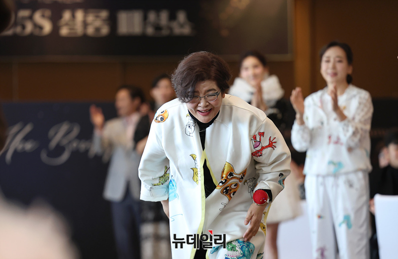 설영희 디자이너가 3일 오후 서울 용산구 그랜드하얏트에서 열린 24W/255 컬렉션에서 런웨이를 마치고 인사를 하고 있다.이번 살롱 패션쇼는 '우주 속으로, 나의 별자리'를 주제로 신비롭고 환상적인 우주 여행에 대한 특별한 메 시지를 담은 작품들로 연말을 장식했다.설 디자이너 아들인 양현준씨가 드로잉한 우주 속의 별자리를 원단에 프린트한 작품들을 함께 선보였다. 메인 컬러는 옐로우(Yellow)이며 오프 화이트 (Off white), 파스타치오 그린(Pistachio green), 버건디(Burgundy), 블랙&화이트(Black & White), 스위트 핑크(Sweet pink) 등으로 함께 화사한 분위기의 컨셉을 살리고, 실크와 울, 레이스, 시퀸 등의 소재를 사용해 고급스러움을 더한 것이 특징이다.