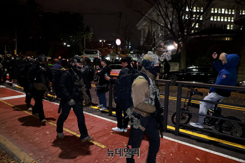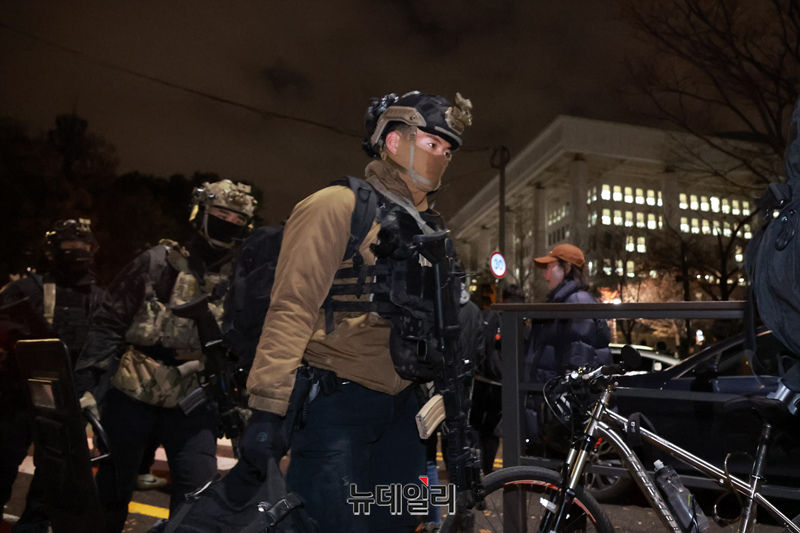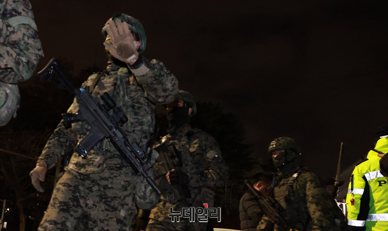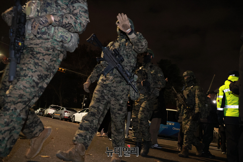 비상계엄이 선포된 4일 새벽 국회의사당에 출동한 군인들이 비상계엄 해제 요구안이 가결된 직후 국회를 벗어나고 있다.