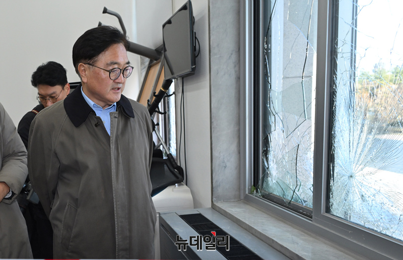 우원식 국회의장이 4일 오전 국회에서 간밤에 윤석열 대통령의 비상계엄 선포로 국회로 진입했던 계엄군의 흔적을 살펴보고 있다.