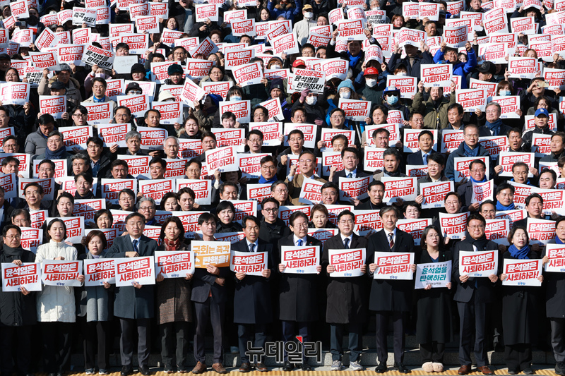 '윤석열 대통령 사퇴촉구 탄핵추진 비상시국대회'가 4일 오전 국회 본청 계단 앞에서 열린 가운데 참석자들이 구호를 외치고 있다.