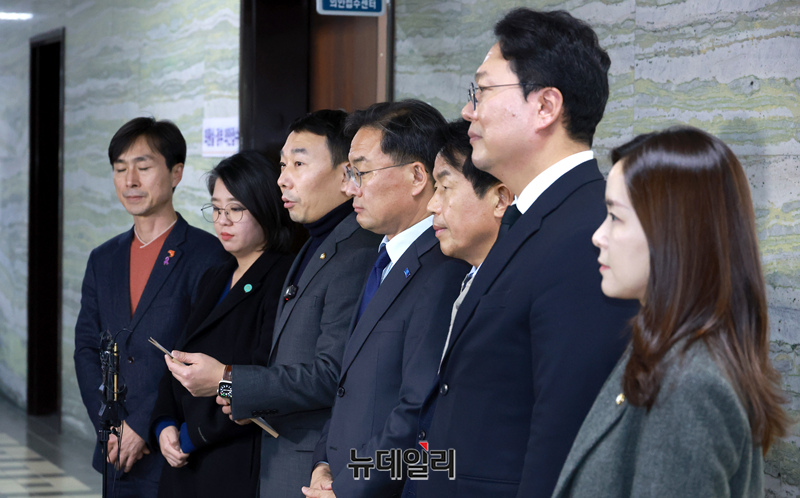 야 6당 김용민 더불어민주당 의원, 한창민 사회민주당 대표, 용혜인 기본소득당 대표, 신장식 조국혁신당 의원, 천하람 개혁신당 원내대표가 4일 오후 국회 의안과에 윤석열 대통령 탄핵소추안을 제출한 후 기자들의 질문에 답하고 있다.