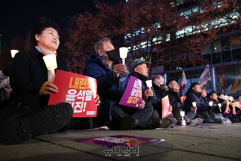윤석열 대통령 퇴진을 촉구하는 집회가 4일 오후 서울 종로구 동화면세점 앞에서 열리고 있다.