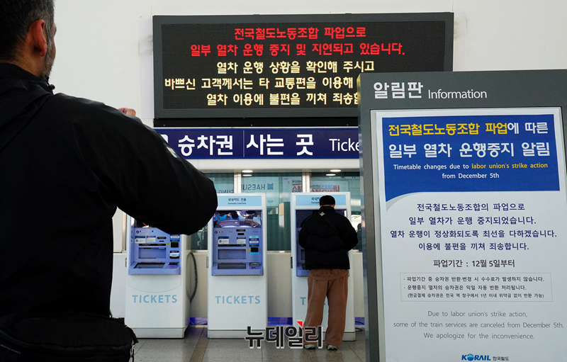 전국철도노조가 무기한 총파업에 돌입한 5일 오전 서울역에 파업관련 알림판이 설치돼 있다. 철도노조는 임금 2.5% 인상, 성과급 체불 해결, 4조 2교대 전면 실시 등을 요구하며 총파업에 돌입했다.
