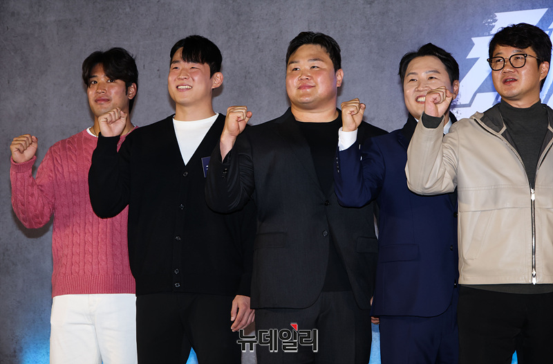 이용운 OK 읏맨 럭비단, 정연식 현대글로비스, 나관영 한국전력공사, 오지명 포스코이앤씨, 김원주 고려대학교, 서우현 연세대학교 선수가 5일 오전 서울 용산 CGV에서 열린 넷플릭스 예능 '최강럭비: 죽거나 승리하거나' 제작발표회에서 포즈를 취하고 있다.