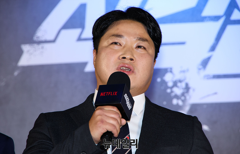 정용검 아나운서와 서인수 해설위원이 5일 오전 서울 용산 CGV에서 열린 넷플릭스 예능 '최강럭비: 죽거나 승리하거나' 제작발표회에서 룰을 설명하고 있다.