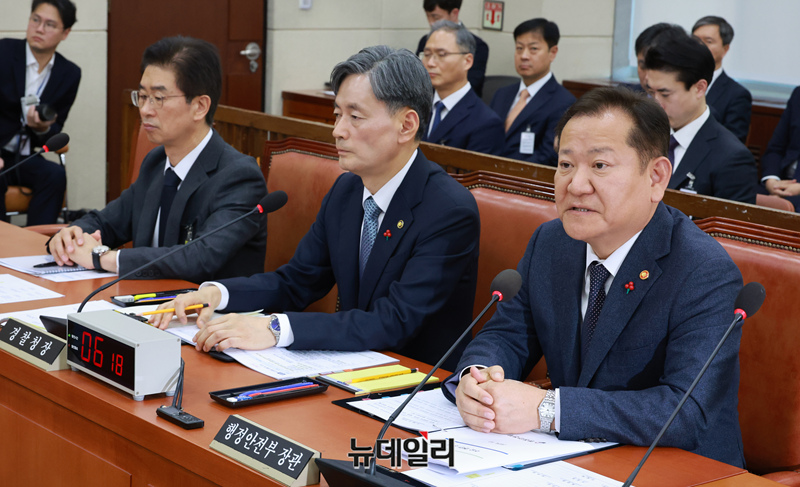 이상민 행정안전부 장관이 5일 오전 국회에서 열린 비상계엄 관련 행정안전위원회 전체회의에 의원들이 질의에 답하고 있다.