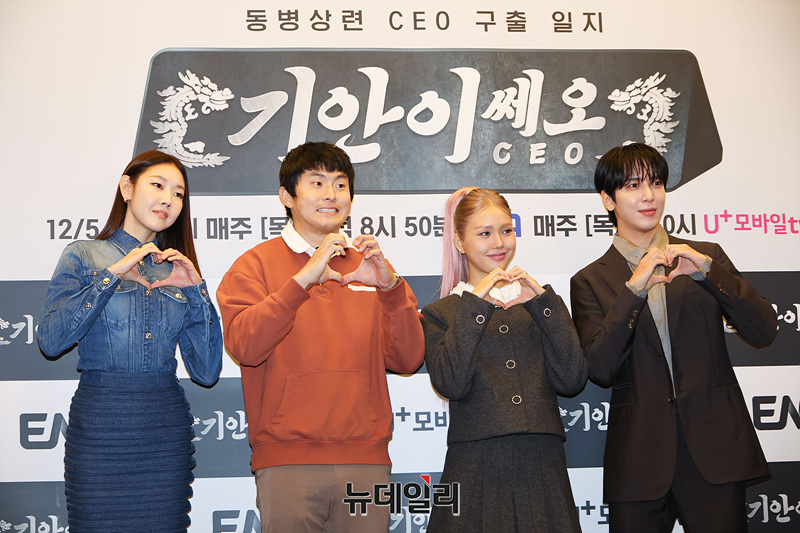 방송인 한혜진, 기안84, 미미, 정용화가 5일 오후 서울 마포구 스탠포드호텔에서 열린 ENA X LG유플러스 예능 '기안이쎄오' 제작발표회에서 포즈를 취하고 있다.