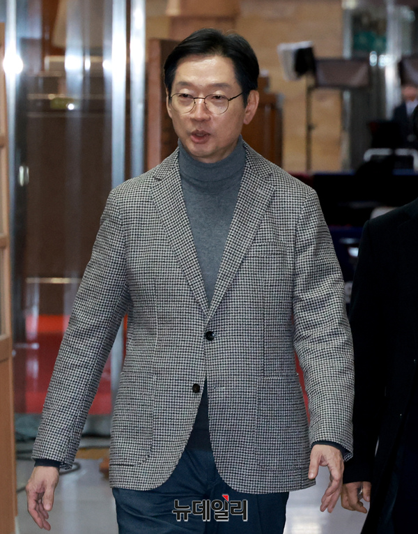 독일에서 급거 귀국한 김경수 전 경남도지사가 5일 오후 국회에서 이재명 더불어민주당 대표를 접견을 위해 당 대표실로 향하고 있다.
