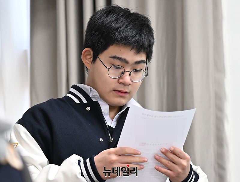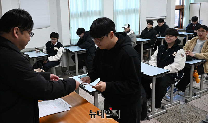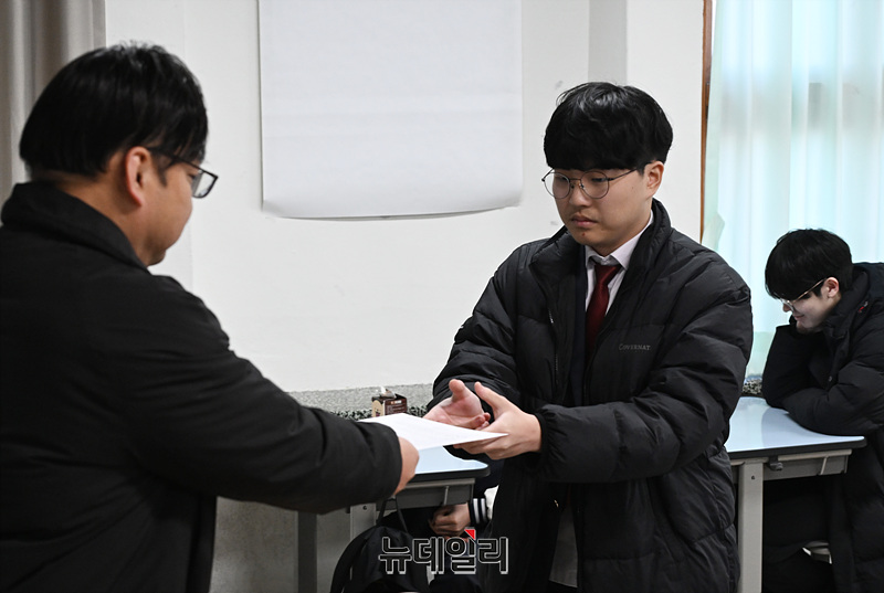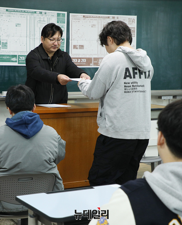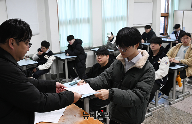 2025학년도 대학수학능력시험(수능) 성적표가 배부된 6일 오전 서울 종로구 동성고등학교에서 고3 학생들이 담임 선생님과 함께 성적표를 받아보고 있다. (사진=공동취재단)