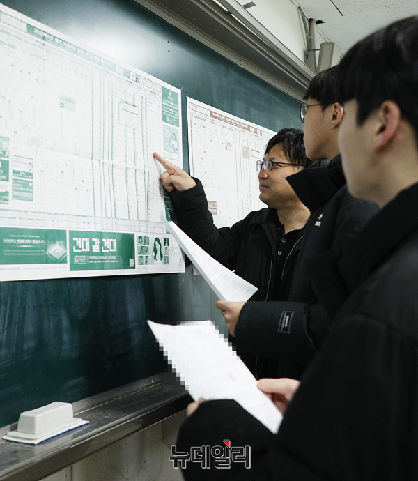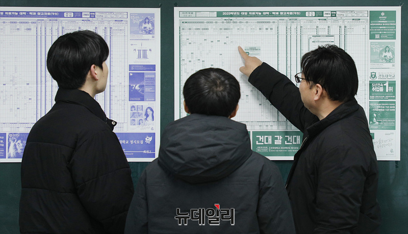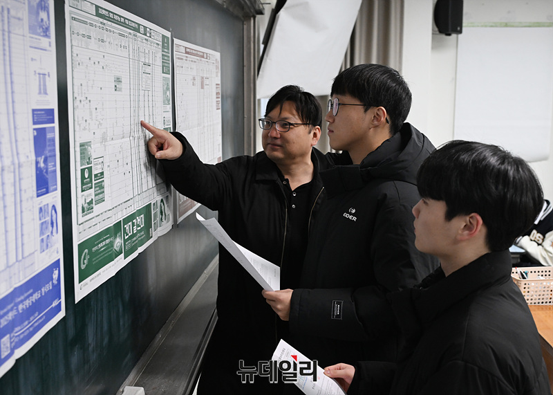 2025학년도 대학수학능력시험(수능) 성적표가 배부된 6일 서울 종로구 동성고등학교에서 고3 담임 선생님이 수험생들과 지원 가능 대학 배치표를 살펴보고 있다. (사진=공동취재단)