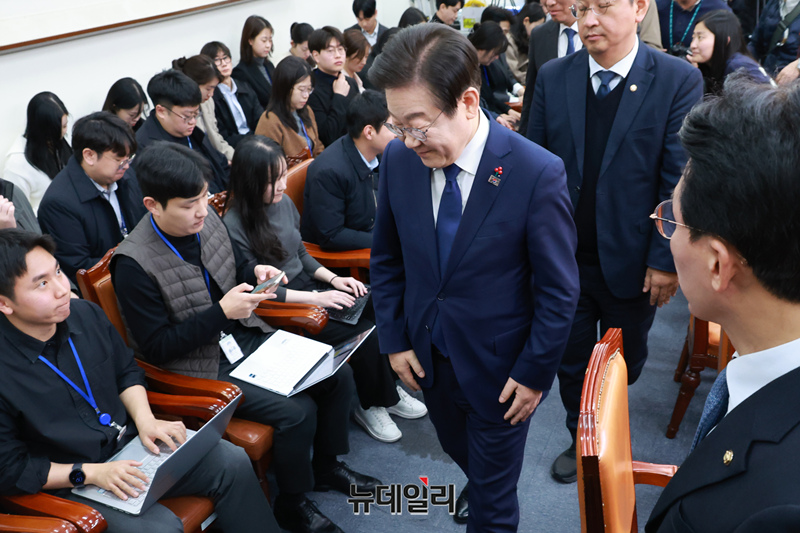 이재명 더불어민주당 대표가 6일 오전 국회에서 '윤석열 내란사태 관련 특별성명'을 발표한 후 참석자들과 인사를 나누고 있다.
