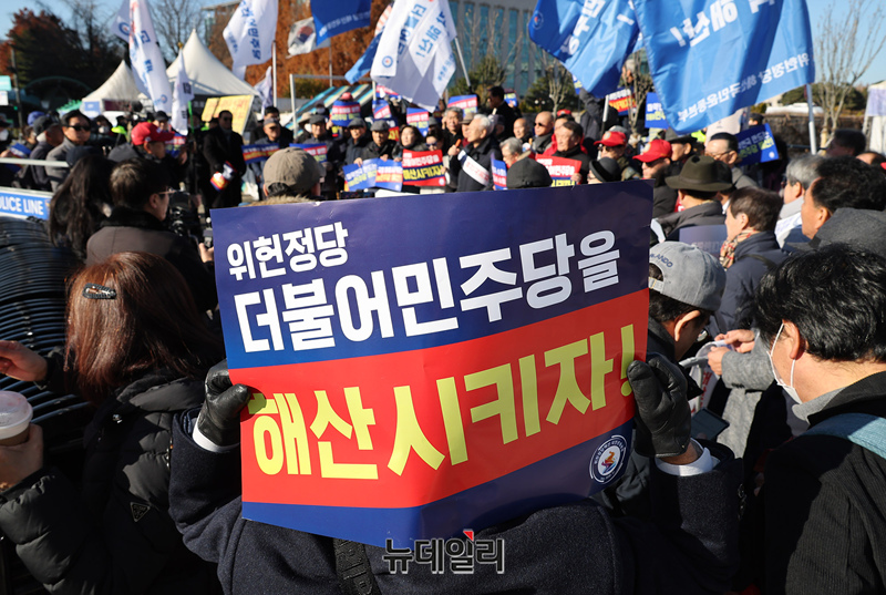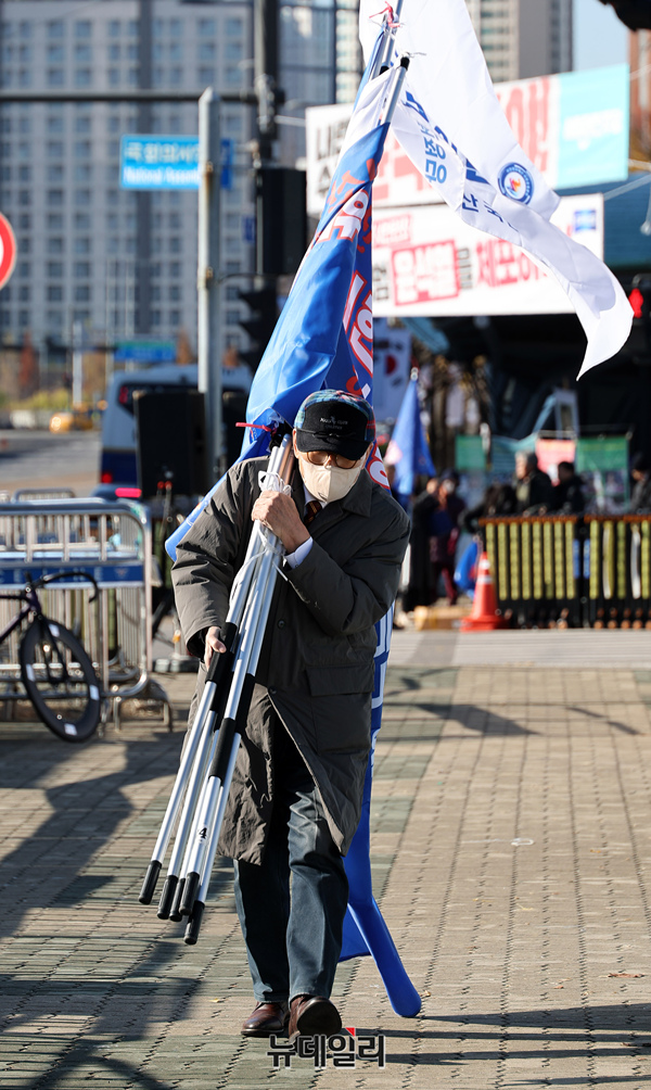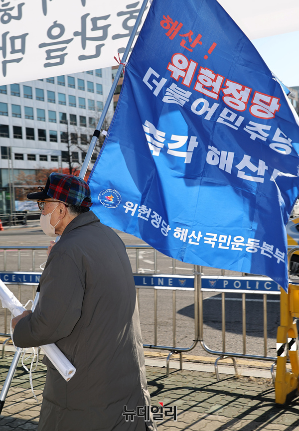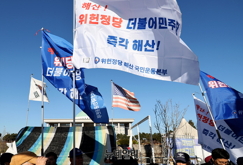 위헌정당해산국민운동본부 회원이 6일 오전 국회의사당 앞에서 열린 비상계엄 관련 자유우파 애국지도자 합동 기자회견에서 민주당 해산을 촉구하는 깃발을 옮기고 있다.