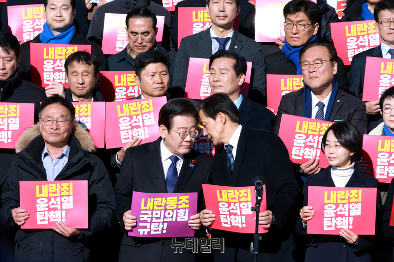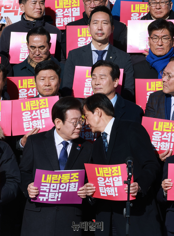이재명 더불어민주당 대표와 조국 조국혁신당 대표가 6일 오전 국회 본청 계단에서 열린 '내란 동조 국민의힘 규탄 및 탄핵소추안 가결 촉구 제시민사회 및 야5당 공동기자회견'에 참석해 대화를 나누고 있다.