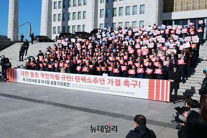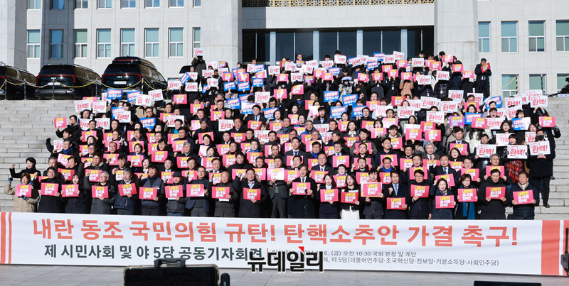 이재명 더불어민주당 대표와 조국 조국혁신당 대표 등 참석자들이 6일 오전 국회 본청 계단에서 열린 '내란 동조 국민의힘 규탄 및 탄핵소추안 가결 촉구 제 시민사회 및 야5당 공동기자회견'에 참석해 있다.