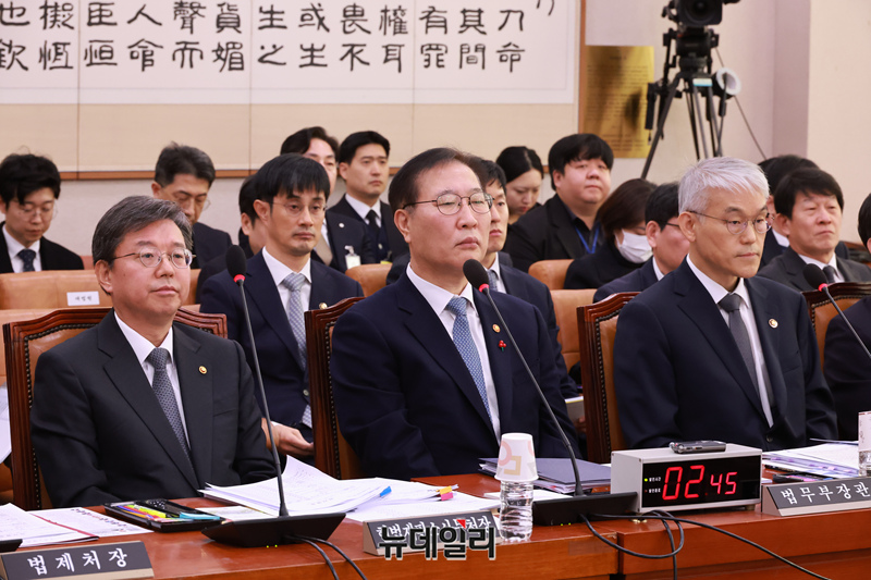 박성재 법무부 장관 등 기관장들이 6일 오전 국회에서 열린 법제사법위원회 전체회의에 자리하고 있다. 왼쪽부터 김선호 국방부 장관 직무대행, 이완규 법체저장, 김정원 헌법재판소 사무처장, 박성재 법무부 장관, 천대엽 법원행정처장, 오동운 고위공직자범죄수사처장, 조은석 감사원장 직무대행.