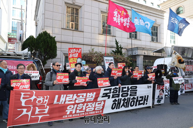 촛불행동이 6일 오후 서울 여의도 국민의힘 당사 앞에서 해체 촉구 기자회견을 갖고 있다.