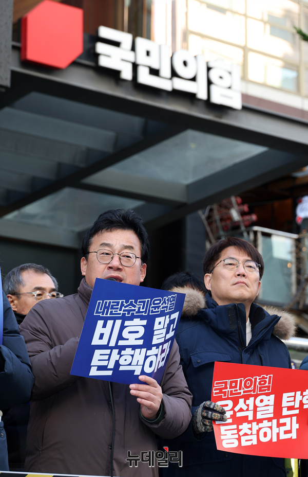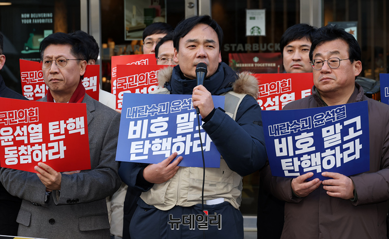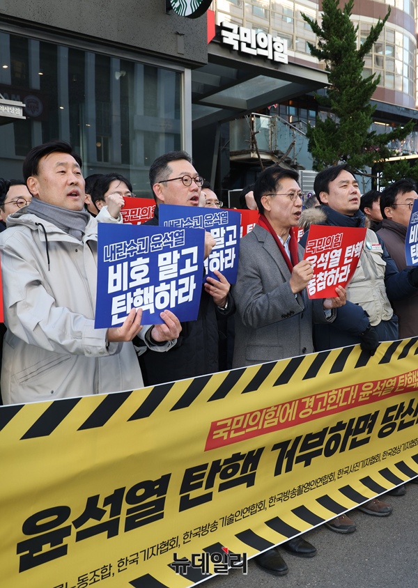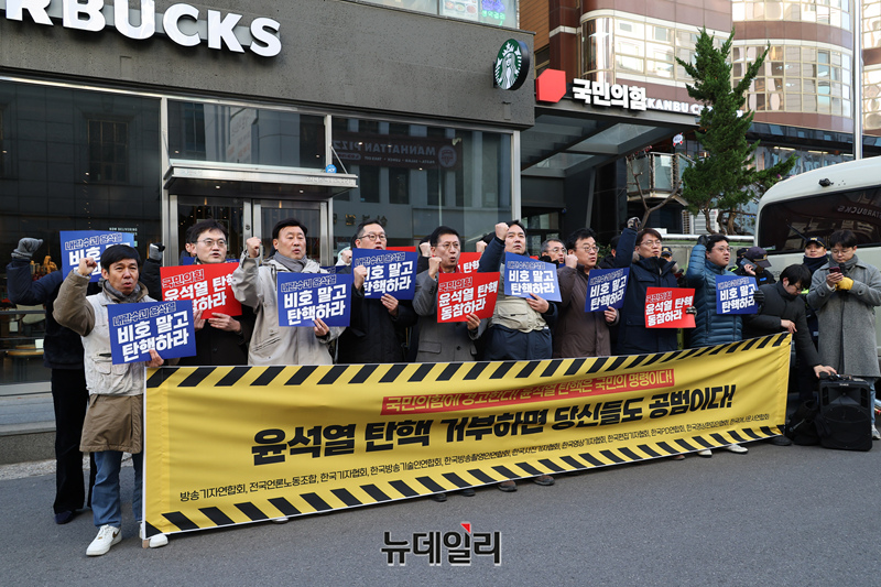 언론현업 11단체가 6일 오후 서울 여의도 국민의힘 당사 앞에서 긴급 기자회견을 열고 윤석열 대통령의 탄핵에 국민의힘이 동참할 것을 촉구하고 있다.