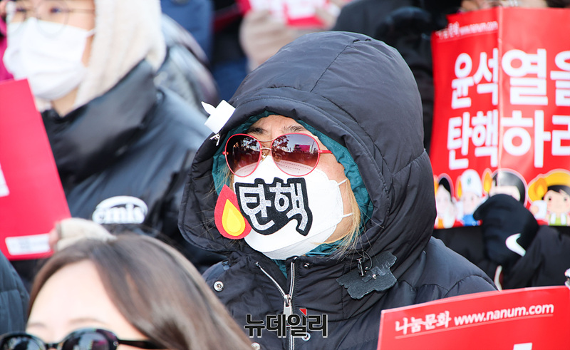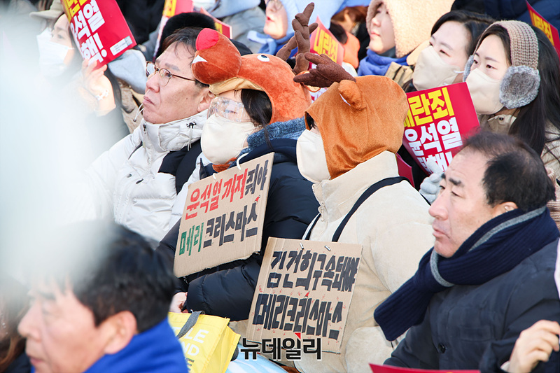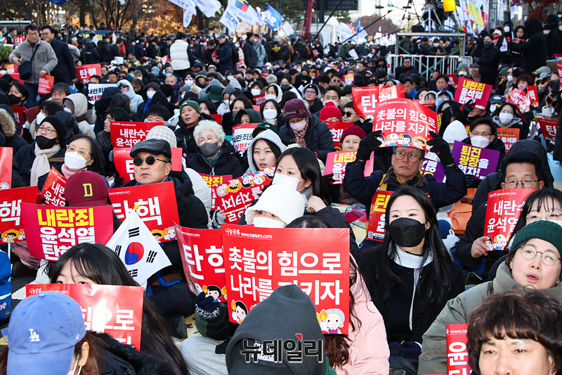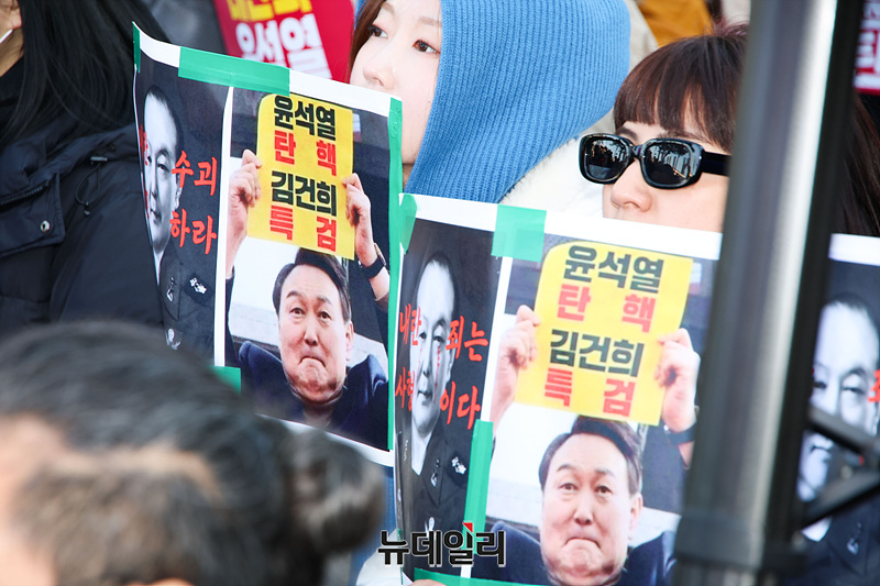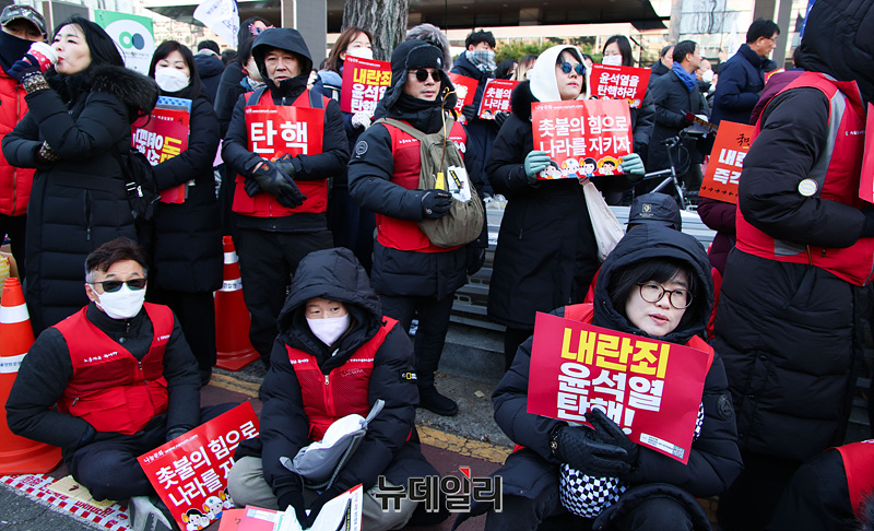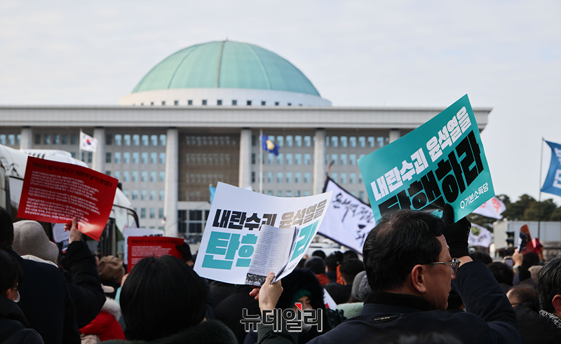 윤석열 대통령 탄핵소추안 표결을 앞둔 7일 오후 서울 여의도 국회의사당 앞에서 시민들이 규탄 문구가 적힌 피켓을 들고 구호를 외치고 있다.