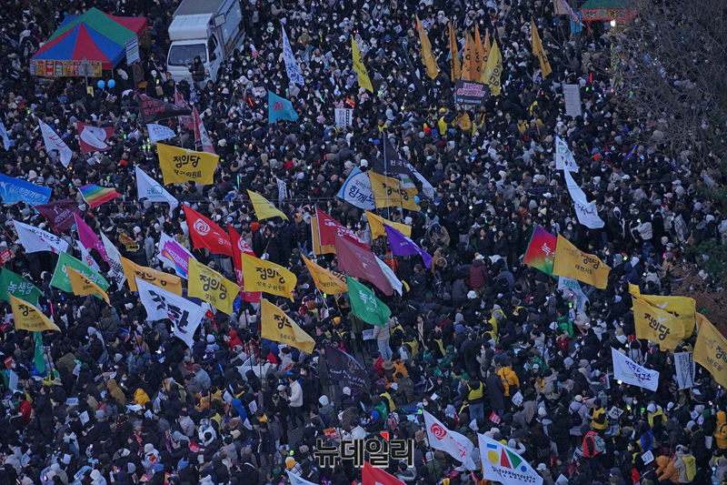 윤석열 대통령 탄핵소추안 표결을 앞둔 7일 오후 서울 여의도 국회의사당 앞에 탄핵을 촉구하는 시민들이 모여 있다.