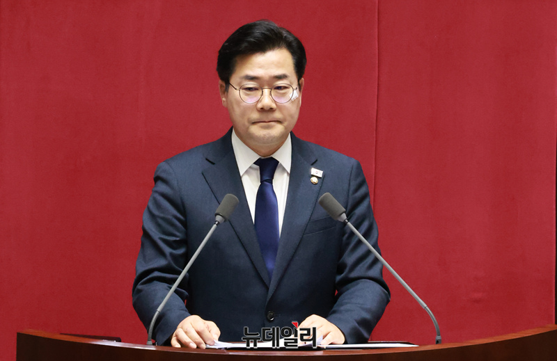 박찬대 더불어민주당 원내대표가 7일 오후 국회 본회의에서 열린 윤석열 대통령 탄핵소추안 제안설명을 하고 있다.