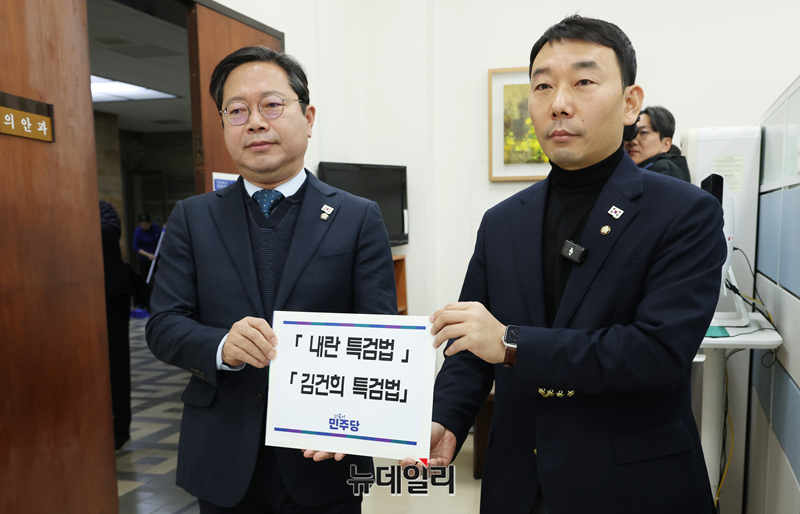 김승원 더불어민주당 법제사법위원회 야당 간사와 김용민 원내수석부대표가 9일 오전 국회 의안과에 '내란특검법'과 '김건희특검법'을 제출하고 있다.