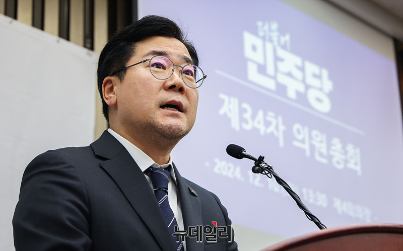 박찬대 더불어민주당 원내대표가 10일 오후 서울 여의도 국회의사당에서 열린 의원총회에서 모두발언을 하고 있다.