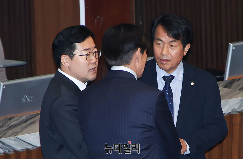 박찬대 더불어민주당 원내대표, 조국 조국혁신당 대표, 윤종오 진보당 원내대표가 10일 오후 서울 여의도 국회에서 열린 본회의에서 대화를 나누고 있다.