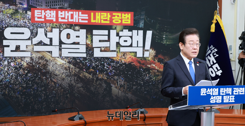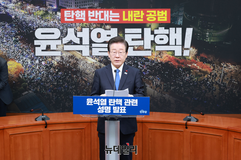 이재명 더불어민주당 대표가 13일 오전 국회에서 윤석열 대통령 탄핵 관련 성명 발표를 하고 있다.