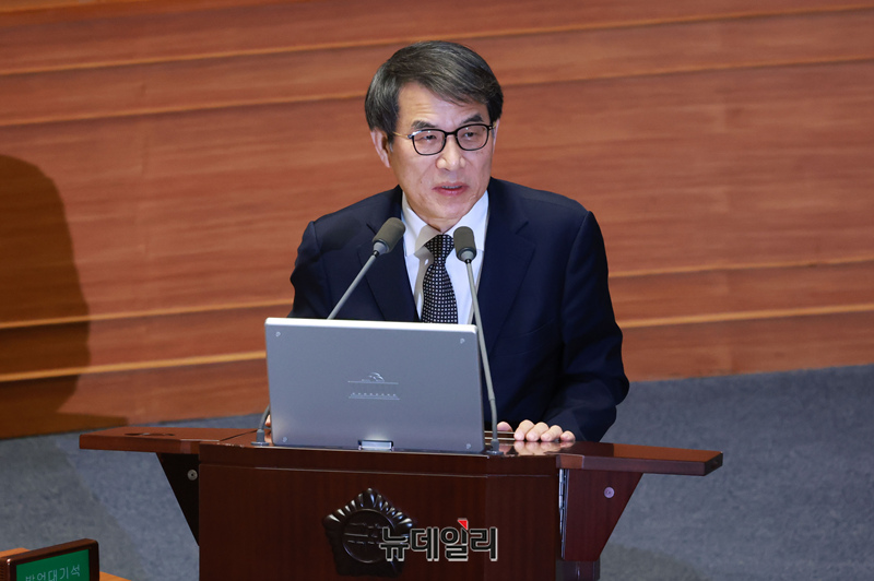 현직 대법관 신분인 노태악 선관위원장이 13일 오후 국회 본회의에서 열린 '윤석열 대통령 위헌적 비상계엄 선포 내란행위 관련 긴급현안질의'에서 단상으로 향하고 있다.