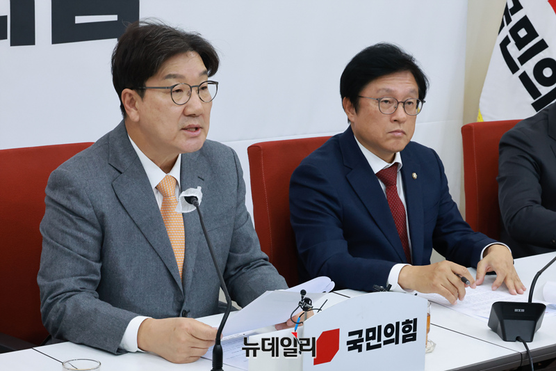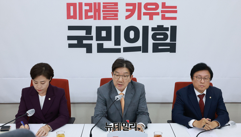 권성동 국민의힘 신임 원내대표가 13일 오후 국회에서 현안 관련 기자간담회를 갖고 있다.