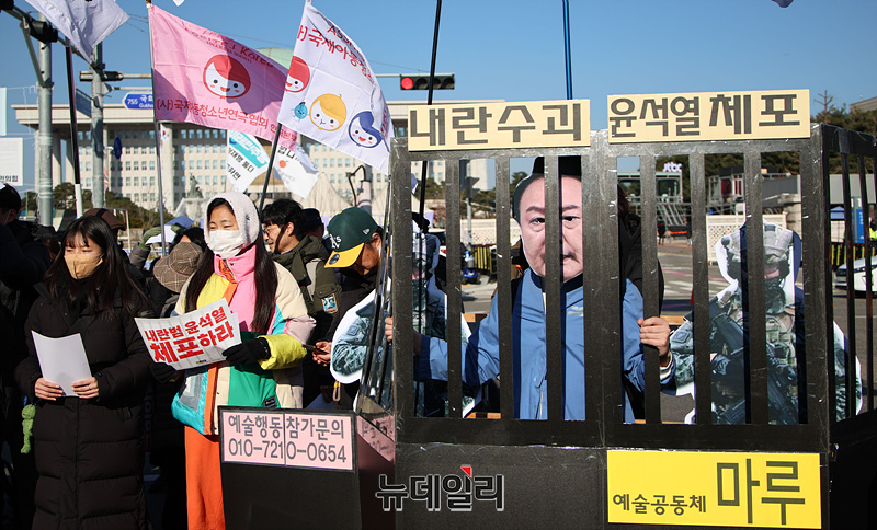 윤석열 대통령에 대한 2차 탄핵소추안 표결을 앞둔 14일 오전 서울 여의도 국회 정문에서 윤석열퇴진예술행동(준) 예술인이 윤 대통령과 계엄군을 감옥에 넣은 형상의 조형물과 가면을 쓰고 있다.