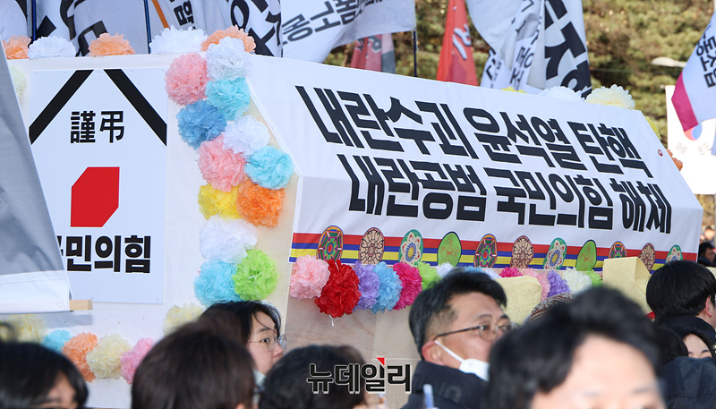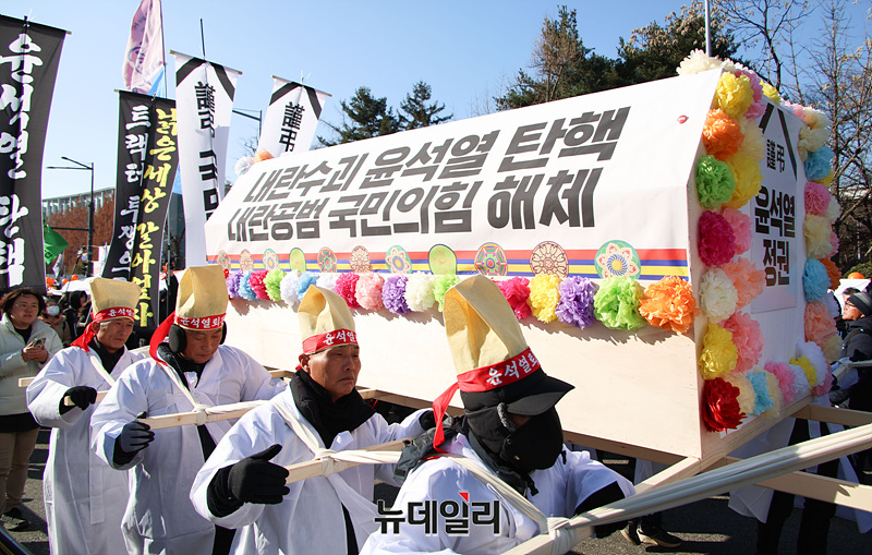 윤석열 대통령에 대한 2차 탄핵소추안 표결을 앞둔 14일 오후 서울 여의도 국회 앞에서 집회 참가자들이 운구행렬 퍼포먼스를 하고 있다.