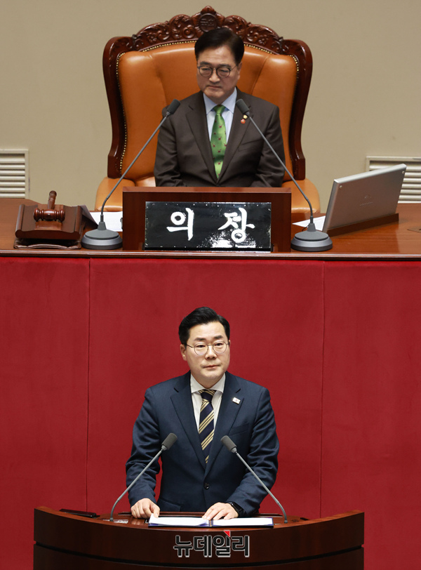 박찬대 더불어민주당 원내대표가 14일 오후 국회 본회의에서 윤석열 대통령 탄핵소추안 표결을 앞두고 제안설명 하고 있다.