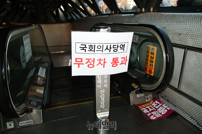 윤석열 대통령 탄핵소추안 2번째 표결일인 14일 오후 국회의사당역 입구에 무정차 통과 안내판이 설치돼 있다.