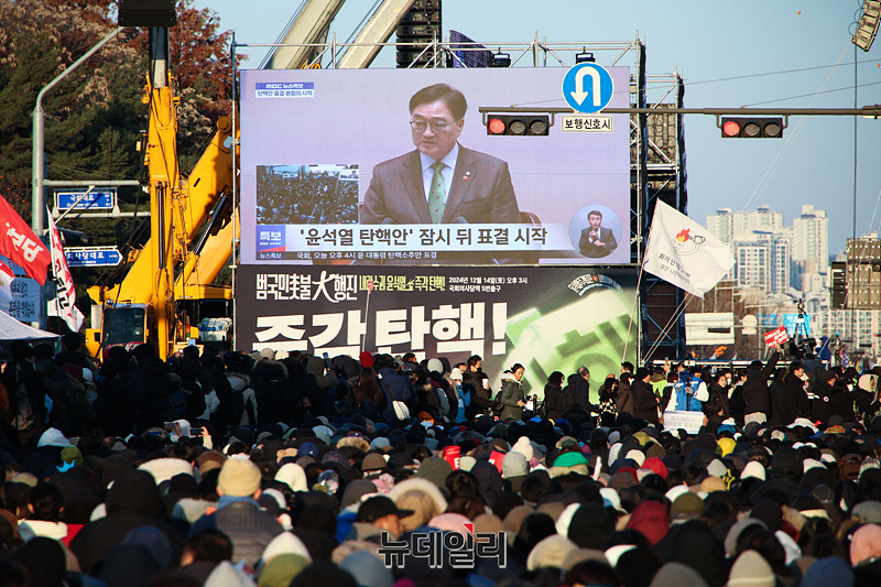 윤석열 대통령 탄핵소추안 2번째 표결일인 14일 오후 국회의사당 앞에서 열린 탄핵찬성 집회에서 참가자들이 개표방송을 지켜보고 있다.