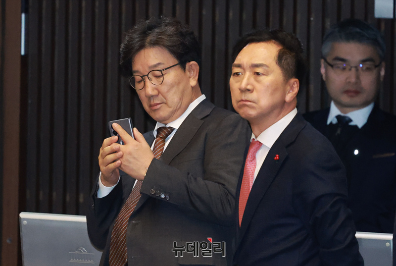 권성동 국민의힘 원내대표가 14일 오전 국회에서 윤석열 대통령 탄핵소추안을 안건으로 열린 본회의에서 투표를 하기 위해 대기하는 중 휴대전화를 숨겨서 보고 있다.
