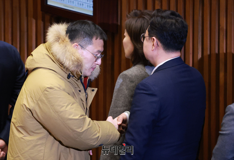 [포토] 의원들과 인사 나누는 김상욱 국민의힘 의원