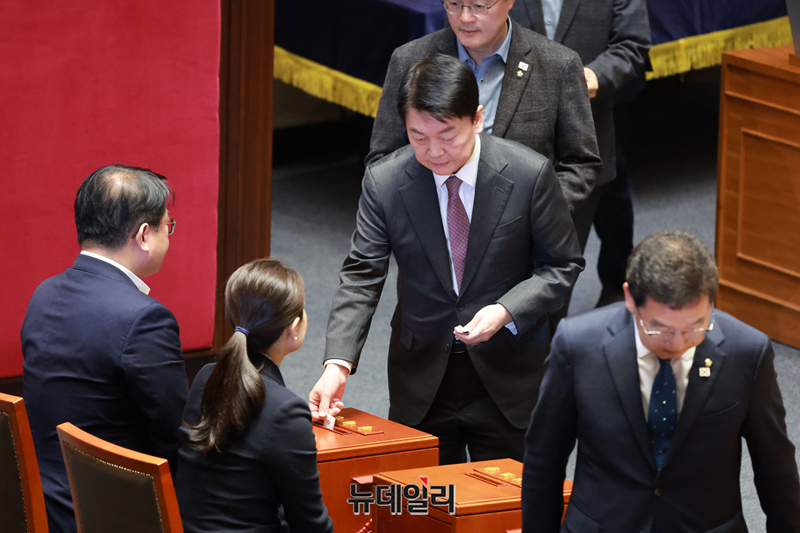 안철수 국민의힘 의원이 14일 오전 국회에서 윤석열 대통령 탄핵소추안을 안건으로 열린 본회의에서 투표를 하기 위해 이동하고 있다.
